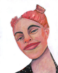 I like that there’s a bit of whimsy in the colour she uses, and in the expressions on the faces. But there’s also a lot more going on. Each one of these pieces has their own character. I find it so much fun to see the stories come alive in my mind when I look at them.