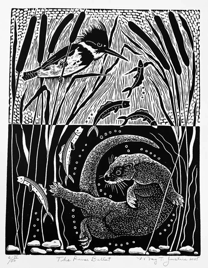 She’s a painter, illustrator and linocut artist who I’ve been seeing on my wall for a while now. I love her work and this one in particular which really encapsulates the essence of these animals. If you’ve ever seen how still kingfishers are when they’re waiting for their next meal, and how playful otters are as they swim and contort their bodies into crazy shapes, I’m sure you can relate to how great this moment she captured is.