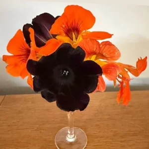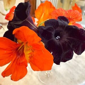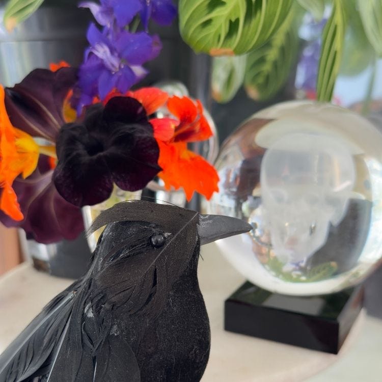 I love that I currently have red-orange nasturtiums and black petunias on the balcony just screaming at me to get out the Halloween decor. OK I’m not gonna lie. Most of it is permanent fixtures like my crows and the skull in the glass ball. but you should definitely let your surroundings get you excited. Put weird colour combinations together. Make little posies one of my favorite things because I always have tiny flowers as cuttings. I’ve never liked taking off a full branch and not seeing the buds come to life so I always have tons of tiny little flowers and making them is one of my favourite things to do. It’s like you get to be a floral artist in miniature!